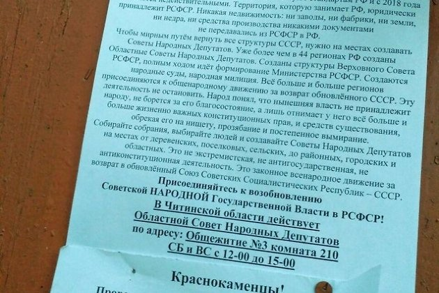 Общественники из Краснокаменского района Забайкальского края, которые называют себя гражданами СССР, расклеили призывающие возвратить обновлённый Советский Союз листовки в Краснокаменске и сёлах района, о движении рассказал 20 мая корреспонденту ИА «Чита.Ру» блогер из Краснокаменска. «Они верят в то, что СССР сейчас существует, делают справки граждан Советского Союза на мутном бланке. Такая справка стоит 300-500 рублей, для неё нужны персональные данные, паспорт, свидетельство о рождении. Я их спрашивал, для какой цели нужны справки, они ответили, чтобы народные богатства поделить между гражданами СССР, при этом других они считают «субъектами юридической организации Российской Федерации», — рассказал он. По его словам, «последователи СССР» проводят свои собрания, избираются самостоятельно на различные должности и уже сменили несколько «верховных правителей». «Вообще, это движение СССР появилось в Москве. Там какой-то товарищ взял кредит, когда не смог его платить, его приставы нач
