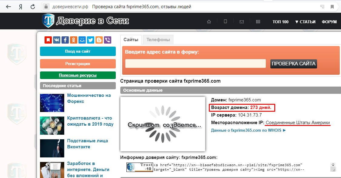 Далее, чтобы точно понимать, что перед нами недобросовестная компания нужно проверить возраст домена, то есть когда его зарегистрировали. Если сайту менее трех – пяти лет, то это еще один признак компании, которая ненадолго открылась, чтобы заниматься недобросовестной деятельностью, а потом когда начнет распространяться негатив просто закрыться, не тратя деньги на обеление свое репутации. Проще всего проверить возраст домена на сайте https://довериевсети.рф вбив адрес сайта в строку для проверки. Для примера проверим возраст домена компании Prime Tech Ltd владеющей сайтом https://fxprime365.com/: