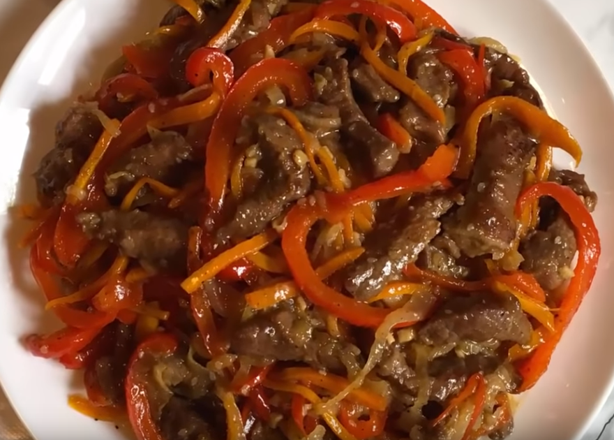 Удивительно вкусное нежное мясо приготовленное по китайскому рецепту доставит массу удовольствия. Делается все легко и просто, а главное — быстро. Состав: - Говядина, мякоть около 500 граммов. - Морковь и лук репчатый по 2 шт. - Болгарский перец 1 шт. - Чеснок 2 зубчика. - Кориандр (кинза) молотый 1 ч.л. - Кунжут 10 граммов. - Картофельный крахмал 35 граммов. - Мед 1 ст.л. - Соевый соус 50 мл. - Соль, перец черный/красный молотый. - Масло подсолнечное рафинированное. В первую очередь хорошо промоем говядину, обсушим от лишней влаги, и нарезаем некрупной соломкой. Нарезанные кусочки говяжьей мякоти панируем в картофельном крахмале и складываем в отдельную тарелку. Мед смешаем с соевым соусом, полученной смесью заливаем говядину и перемешиваем. Для мариновки мяса отправляем его в холодильник примерно на 30 минут. Пока маринуется мясо, подготавливаем овощи. Измельчим чеснок, лук шинкуем тонкими полукольцами, а морковь и болгарский перец нарезаем тонкой соломкой. Берем глубокую сковороду,