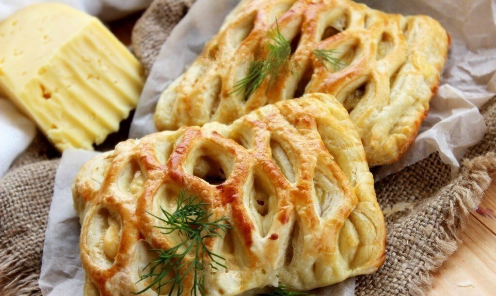 Наша начинка готова. Приступаем к формовке изделий. Рабочую поверхность присыпать мукой и выложить размороженное слоеное тесто. Затем разделить его на равные части (я использовала готовые квадратные пластинки слоеного теста).