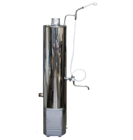 Здравствуйте, сегодня у нас обзор водогрейного дровяного титана со встроенной топкой и нержавеющим баком КВС 10 2 Ермак. Дровяной титан изготавливается компанией Ермак, расположенной в городе Киров. Это универсальный водонагреватель для загородного дома и дачи, предназначен для организации нагрева воды в местах, где отсутствует горячее водоснабжение. Принцип работы водонагревателя – накопительный. Нагрев воды происходит во время сжигания дров в топке при полном баке, а также с помощью электричества при подключении ТЭНа. Требуется только подвести к баку холодную воду с минимальным давлением 0,6 атмосфер. Титан не предназначен для работы под давлением выше одной атмосферы, перед его монтажом и использованием обязательно изучите руководство по эксплуатации! Большим плюсом дровяного титана является возможность его установки в неотапливаемом помещении. За счет выделяемого титаном тепла, помещение нагреется до комфортной температуры. Таким образом, его можно использовать практически кругло