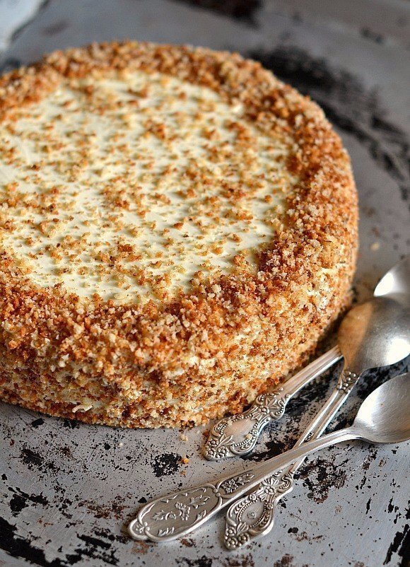 Всем привет дорогие друзья!Сегодня у нас будет рецепт бананового тортика! Банановый торт Ингредиенты: 2 очень спелых банана 2 крупных яйца 100 гр сахара 50 гр сливочного масла 2 ст.л сметаны 150-170 гр муки пакетик разрыхлителя (10 г) горсть грецких орехов Для крема: 1 банка сгущенного молока 1 пачка сливочного масла Приготовление: 1. Разбить в миску яйца, добавить сахар и сметану. Взбить венчиком. Масло растопить, бананы размять вилкой. Добавить масло и бананы в ячную смесь. Грецкие орехи порубить ножом, добавить в тесто. Всыпать муку с разрыхлителем. Все хорошо перемешать, вылить тесто в форму (у меня 22 см), выпекать при 190 градусах минут 40. 2. Когда пирог остынет, разрежем его на 2 коржа, аккуратно срежем верхушку и бока. Измельчить обрезки в блендере. 3. Крем: взбить мягкое сливочное масло со сгущенкой. Промажем торт внутри и снаружи кремом, украсим бока крошкой...Вот и все!) Приятного аппетита!