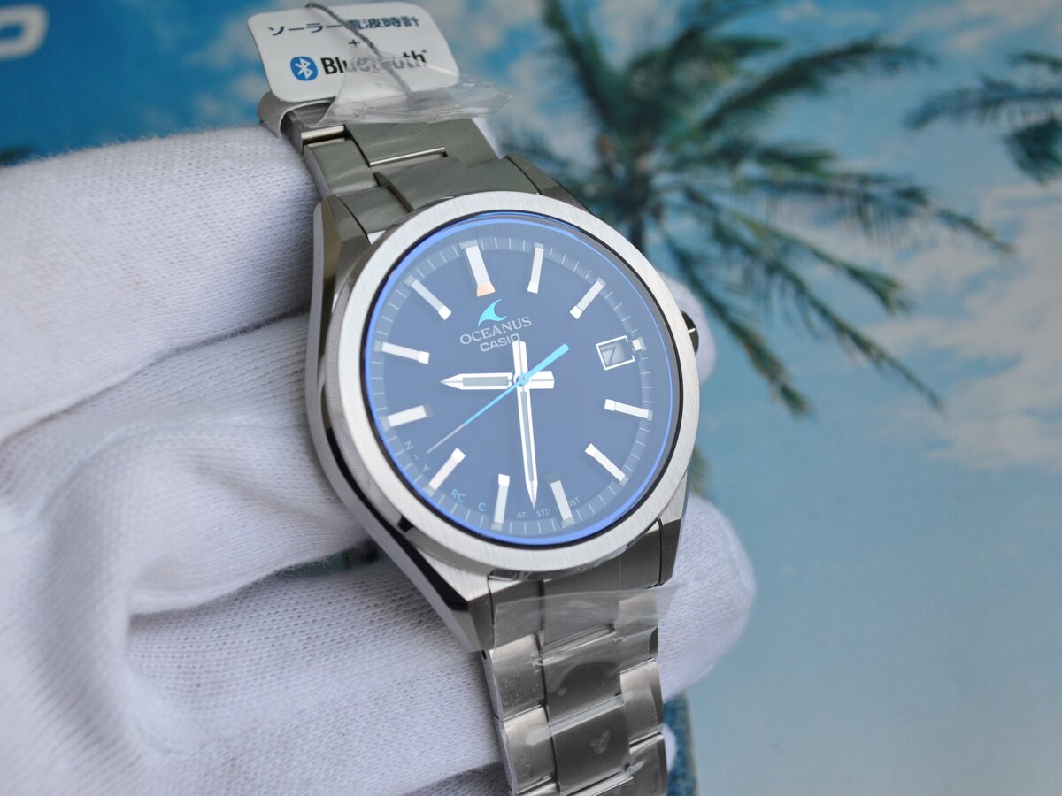 Очень часто слышу [читаю] людей, которым надо вот точно такие же, но с перламутровыми пуговицами, а точно таких же нет. Узнали себя? :). Когда мы выбираем себе часы, то постоянно сталкиваемся с отсутствием нужной нам модели, в стане внутрияпонских трехстрелочников основная проблема – отсутствие стальных часов. Как известно, титановые часы легкие, даже невесомые, что многим не нравится, также сам металл “теплый”, а сталь наоборот холодит. В бюджете 500$ достойной стальной модели на каждый день не было, но всё изменилось в 2019 году, Касио выпустила новые T200S в стали, да ещё и с Блютузом. Встречаем! P.S. Все фото кликабельные. Сразу же бросается в глаза чуть другой дизайн этих часов, преимущественно матовая полировка, даже на безеле, что мне очень понравилось, не так сильно будут видны мелкие царапины. Циферблат черный, но с фирменным отливом синего цвета, благодарю внутреннему синему кольцу – фирменная фишка линейки Океанус. Фото сравнение “сотки” и “тэшки”, как мне показалось пе