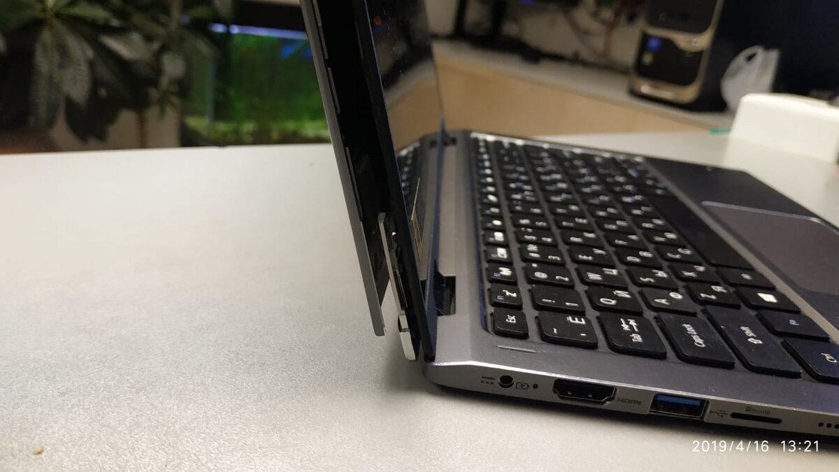 Сломалась крышка матрицы. Причем сама, никто не помогал. На современных ноутбуках довольно распространенная проблема. Все миниатюрное, пластик не очень хорошего качества, вот и ломается под нагрузкой при открывании и закрывании крышки матрицы.