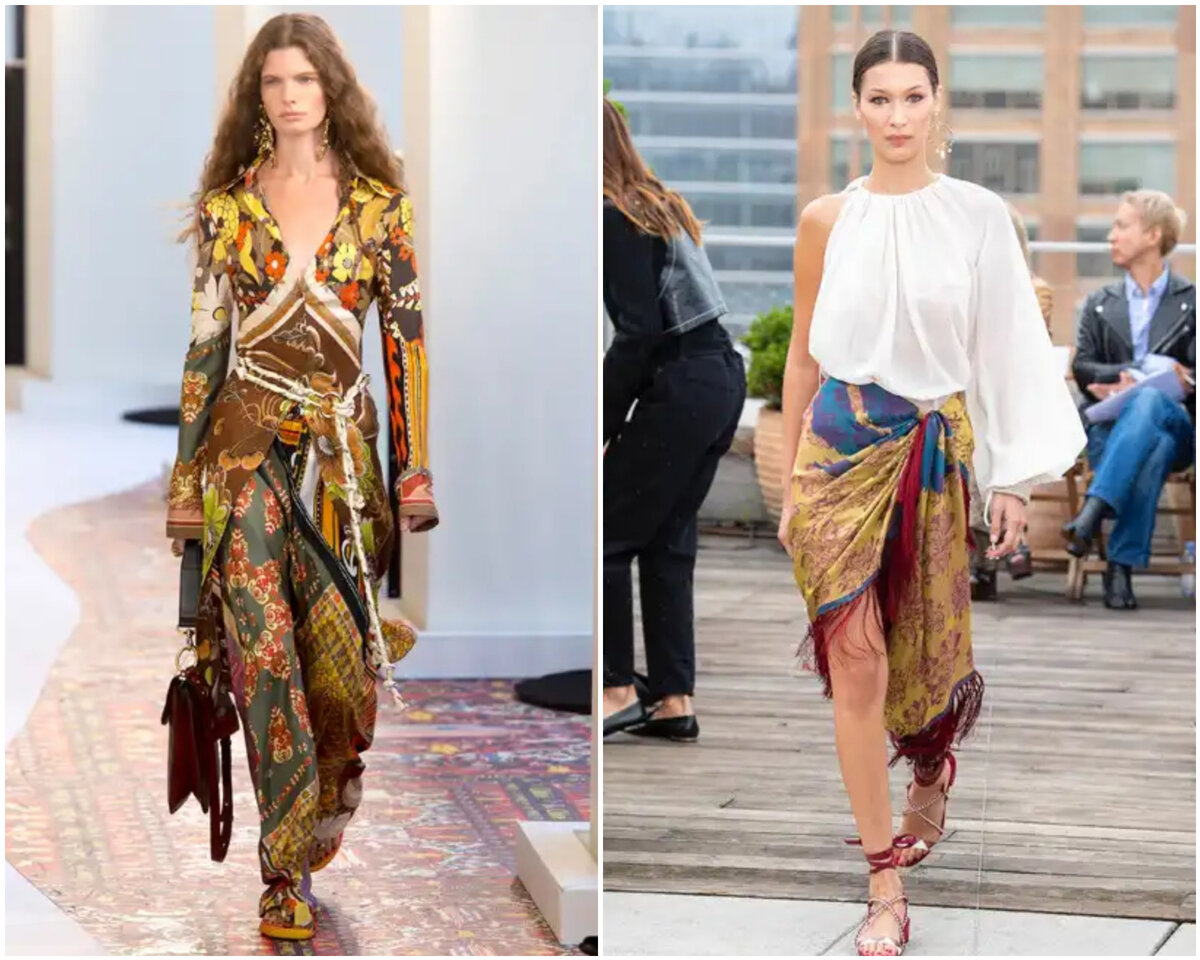 Платочная тема прослеживается в коллекциях у Oscar de la Renta, Paco Rabanne, Chloe, а у брендов Acne Studios и The Row есть симпатичные сумочки из платков.