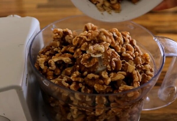 В глубокой посуде собираем 3 желтка и полкило муки (сорт экстра). Затем добавляем ледяное (уже рубленое) масло. Перемешиваем все составляющие погружным блендером. Важно сказать, что масло необходимо измельчить в крошку. Далее присоединяем 5 гр. соды и 300 гр. домашней сметаны. Перетираем вручную ингредиенты до получения гладкого теста, не липнущего к рукам, и отправляем его на холод. Теперь подготавливаем начинку, которая будет намного нежнее, если очень мелко порубить 350 гр. грецких орехов (можно заменить любыми другими), 5 гр. кардамона и 300 гр. белого сахар