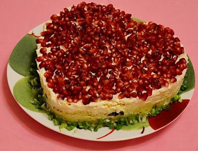 Этот яркий на рядный салатик станет центральным блюдом даже самого изысканного стола. Он очень сытный и вкусный. Благодаря гранатовым зернам, блюло получается свежим и с приятной кислинкой. Для салата потребуется: · 350 г куриного филе; · 10 шт. крупных шампиньонов; · 1 большой спелый гранат; · 2 репчатых луковицы; · 4 куриных яйца; · 4 средних картофелины; · по 150 г сметаны и майонеза; · по 2 ст. л. уксуса и оливкового масла; · соль, перец – по вкусу; · 1 г зеленого лука. Приготовление: 1. Помойте и отварите филе, картофель и яйца. Почистите и помойте лук и грибы. Из граната аккуратно извлеките зерна. 2. Лук нарежьте тоненькими полукольцами, высыпьте в отдельную миску, залейте кипятком, посолите и добавьте уксус. Для улучшения вкусовых качеств лука можете добавить немного сахара. Все тщательно перемешайте и оставьте на полчаса. Теперь переходим к остальным ингредиентам. 3. На хорошо разогретую сковороду налейте оливкового масла и поджарьте произвольно нарезанные грибочки. Добав