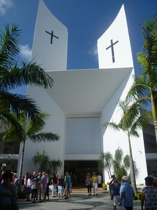 Отправляясь в Канкун на побережье Карибского моря, я уже заранее знала, что обязательно найду там христианскую церковь. Само поселение насчитывает сотни лет, и я надеялась увидеть что-то хотя бы времен Христофора Колумба. Но этот храм Воскресшего Христа появился только после 1995 года. Рядом с пиратскими кораблями В Канкуне отели для пляжного отдыха расположены на узком участке суши, который врезается в море и тянется на протяжении 30 км. Это место называется зоной Хотельера. В ширину «косичка» - всего 400 м. На восточном берегу – пляжи Карибского моря и залива Женщин. С запада – лагуна Ничупте с мангровыми деревьями. Деловая часть города расположилась на материковой части, и сюда даже ночью курсируют городские автобусы. Мы жили в скромном отеле, но зато в самом центре косы Хотельера рядом с паромным причалом, где можно было увидеть настоящие пиратские корабли. Но главное, что верующий человек хочет найти в чужой стране, – это свой храм. Я говорю о христианском. Дева Мария встречает в