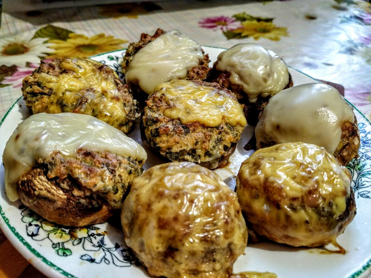 Рецепт универсальной закуски на любой праздник и просто побаловать близких. Нам понадобится: Грибы шампиньоны - 500 гр ( 8 больших шляпок) Фарш индюшиный (куриный) - 150-200 гр Сыр плавленый - 1 шт Сыр твердый - 250-300 гр Сметана (майонез) - 1 ст. л. Чеснок - 2-3 зуб. Зелень(укроп, петрушка, кинза, базилик) по вкусу Соль Перец Для начала чистим грибы и удаляем ножки. Приступаем к приготовлению наших начинок. Первая начинка: - Измельчаем зелень и трем плавленый сырок: - Натираем 100 гр твердого сыра: Все это ссыпаем в одну пиалу, добавляем туда измельченный чеснок и сметану: - Смешиваем и фаршируем половину грибов: Вторая начинка: Натираем 100 гр твердого сыра и добавляем его в фарш. Солим и перчим по вкусу: Все это перемешиваем и фаршируем оставшуюся половину грибов: Все наши грибочки выкладываем на одну сковородку, смазанную сливочным маслом, и отправляем в предварительно разогретую духовку. Выпекаем при температуре 200-220 градусов около часа. За 5-10 минут до окончания посыпаем св