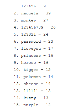 Пароль - это условный набор символов,который используется для аутентификации (сопоставления личности с базой данных пользователей) на каком-либо ресурсе. Взлом паролей существует 3 основных способа взлома паролей : 1) Прямой перебор слов (брутфорс) - специальное программное обеспечение, которое перебирает все возможные комбинации символов в пароле. Этот способ еще называется "в лоб". Подробнее о защите от прямого перебора расскажу чуть ниже. 2)Подбор по словарям - этот способ основывается на предположении,что пользователь мог использовать в пароле определенное слово или же словосочетание. На изображении ниже топ 15 самых используемых паролей в мире :) 3)Социальная инженерия - это моя самая любимая тема. Здесь как раз собраны все несчастные пароли в виде какой-либо личной информации : даты рождения,номера телефона, своего имени и так далее. Многие люди используют личную информацию,что облегчает работу злоумышленникам.