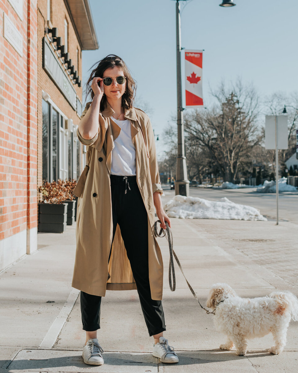 Легкие брюки базового оттенка прекрасно сочетаются как с нейтральными, так и с яркими вещами. Мы предлагаем носить их с простой белой футболкой, кожаными кедами и классическим тренчем. Добавьте лаконичный аксессуар – солнцезащитные очки. Этот удобный аутфит придется по душе модницам, которые делают ставку на практичность.