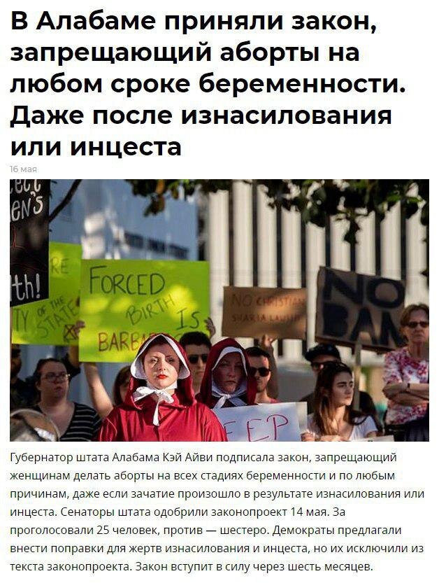 В Алабаме принят закон о почти полном запрете абортов, даже после инцеста или изнасилования. За закон - 25 сенаторов, против - 4. После митингов и высказываний в прессе, в атаку пошли селебрити. Риана обозвала сенаторов, голосовавших за запрет абортов идиотами...