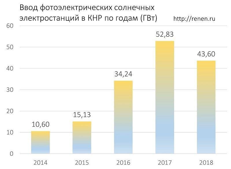 По итогам 2018 г установленная мощность фотоэлектрических солнечных электростанций достигла 174,63 ГВт, а ветровых — 184,2 ГВт. Их суммарная доля составила примерно 19% от установленной мощности энергосистемы. Несколько лет назад такое развитие невозможно было представить. Потребление электроэнергии выросло на 8,5%. Это самый высокий рост за последние семь лет, который отчасти объясняется аномально низкими температурами в зимние месяцы, однако основная причина – это трансформация и модернизация промышленности, усиление роли электроэнергии. Ожидается (http://renen.ru/the-total-installed-capacity-of-china-s-solar-and-wind-power-plants-exceeded-350-gw/), что в 2019 году потребление электричества в КНР увеличится еще на 5-8%. О темпах роста энергетики КНР в сравнении с РФ. Установленная мощность-нетто электростанций: Китай: 166 818 МВт (1992 г.) 1 657 907 МВт (2015 г.) Россия: 213 099 Мвт (1992 г.) 257 075 Мвт (2015 г.) Доля ВИЭ без гидро (2018 г.) Россия 0,01% Китай 19% В ближайшие два го