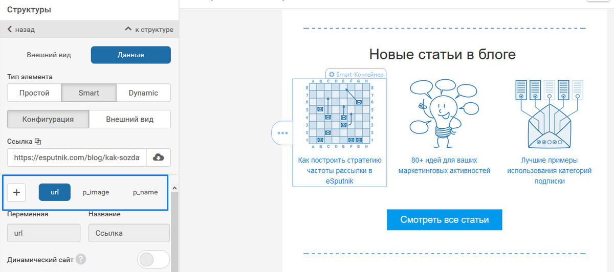 Дальше дело за малым: из модулей перетягиваем готовый контейнер в структуру, проставляем нужные ссылки в поле url смарт-блока и данные подтягиваются автоматически.