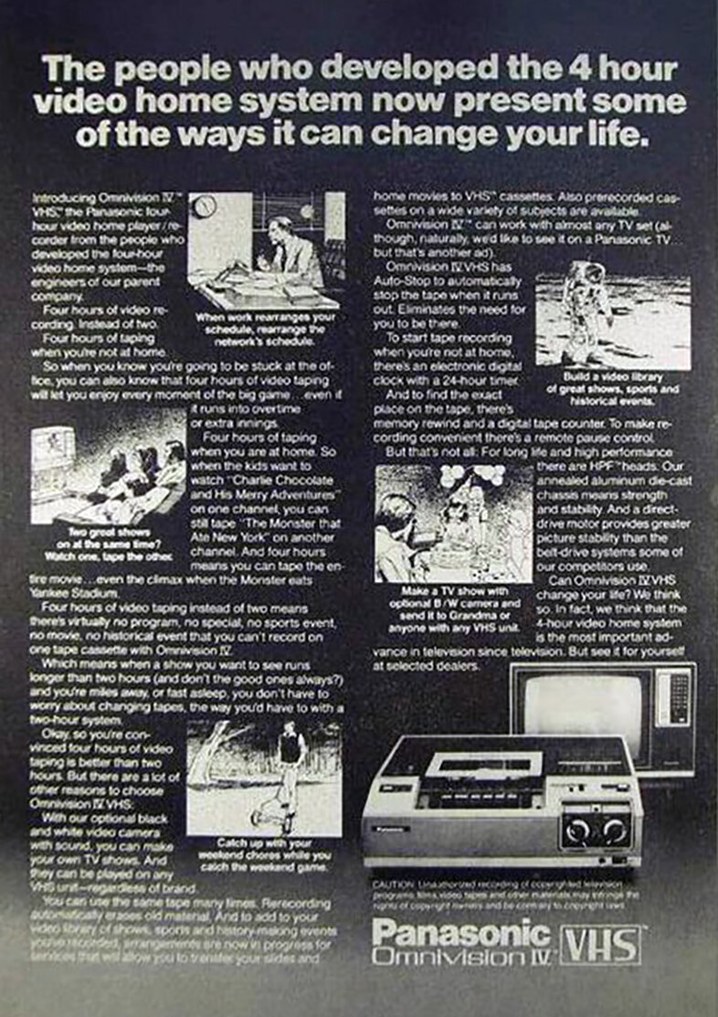 В 1977 году Matsushita Electric Industry выпустила компактный видеомагнитофон, ставший ключевым компонентом во взлете популярности видеомагнитофонов VHS. Чтобы удовлетворить потребности пользователя в длительной записи, в 1977 году для американского рынка был добавлен режим 2x (LP), а в 1979 году – режим 3x (EP), и был расширен ассортимент моделей.