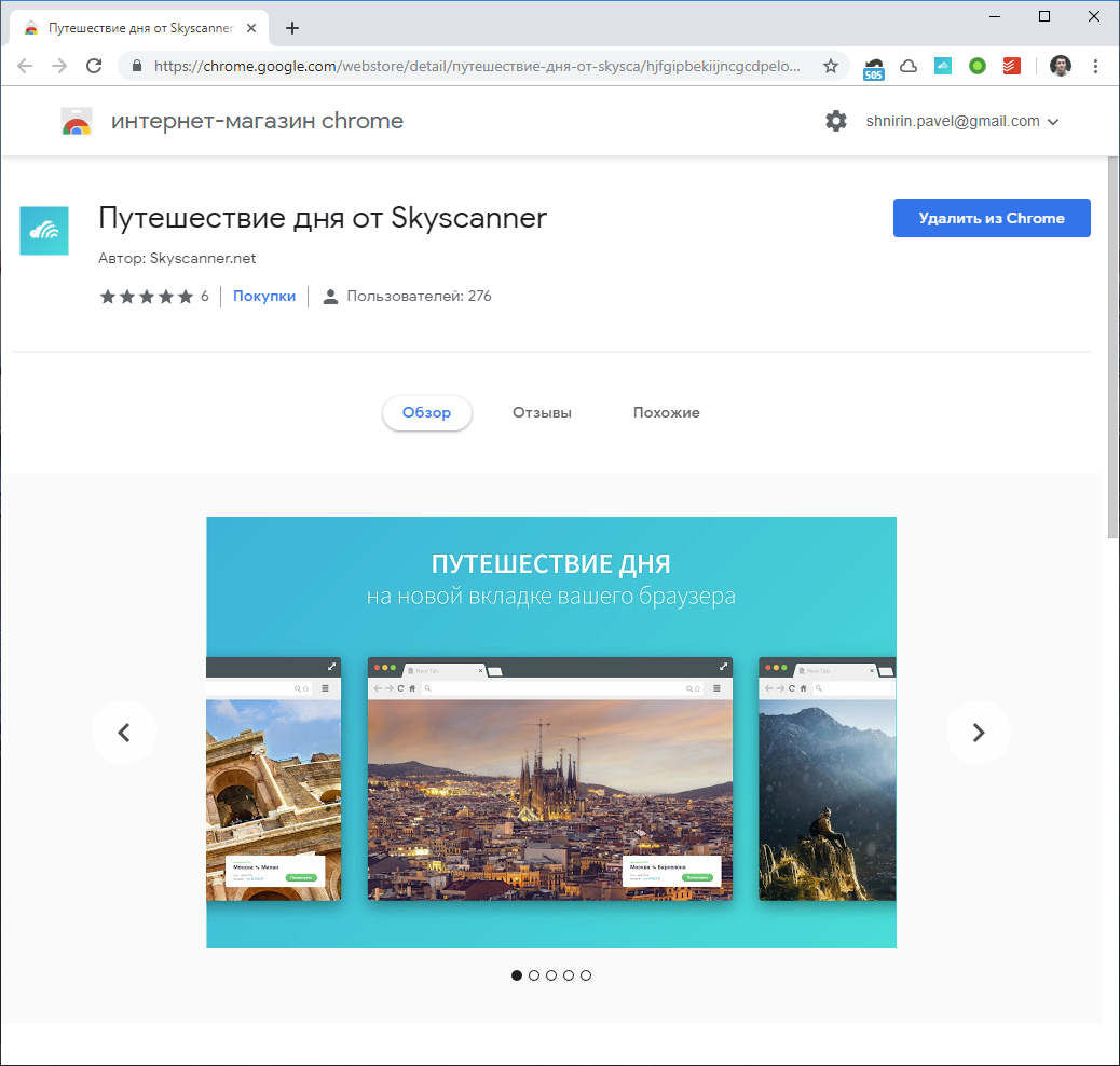 В эфире непостоянная рубрика обзоров приложений для путешественников. Сегодня у нас свежее расширение для браузера Google Chrome и его производных. Расширение называется "Путешествие дня от Skyscanner". Посмотрим повнимательнее и узнаем, что оно умеет. Расширение заменяет собой содержимое новой вкладки. Каждый раз, открывая ее, вы будете видеть сегодняшнее путешествие дня от Скайсканера. Алгоритмы нам неведомы, но выбираются направления с наибольшей скидкой от обычной цены на сегодня. Обновляются раз в сутки. Вот, что нам показывается сегодня. Все симпатично, ничего лишнего, красивая картинка немного анимирована, как заставка у Apple TV. Как можно понять по этой картинке, расширение не всегда верно сопоставляет картинки и направления, так как фотография явно не Лиссабона. Других багов замечено не было. Можно нажать на кнопку "Посмотреть" и попасть на страницу с предложениями по этому направлению с такой ценой, все довольно просто. В настройках расширения можно выбрать город вылета,