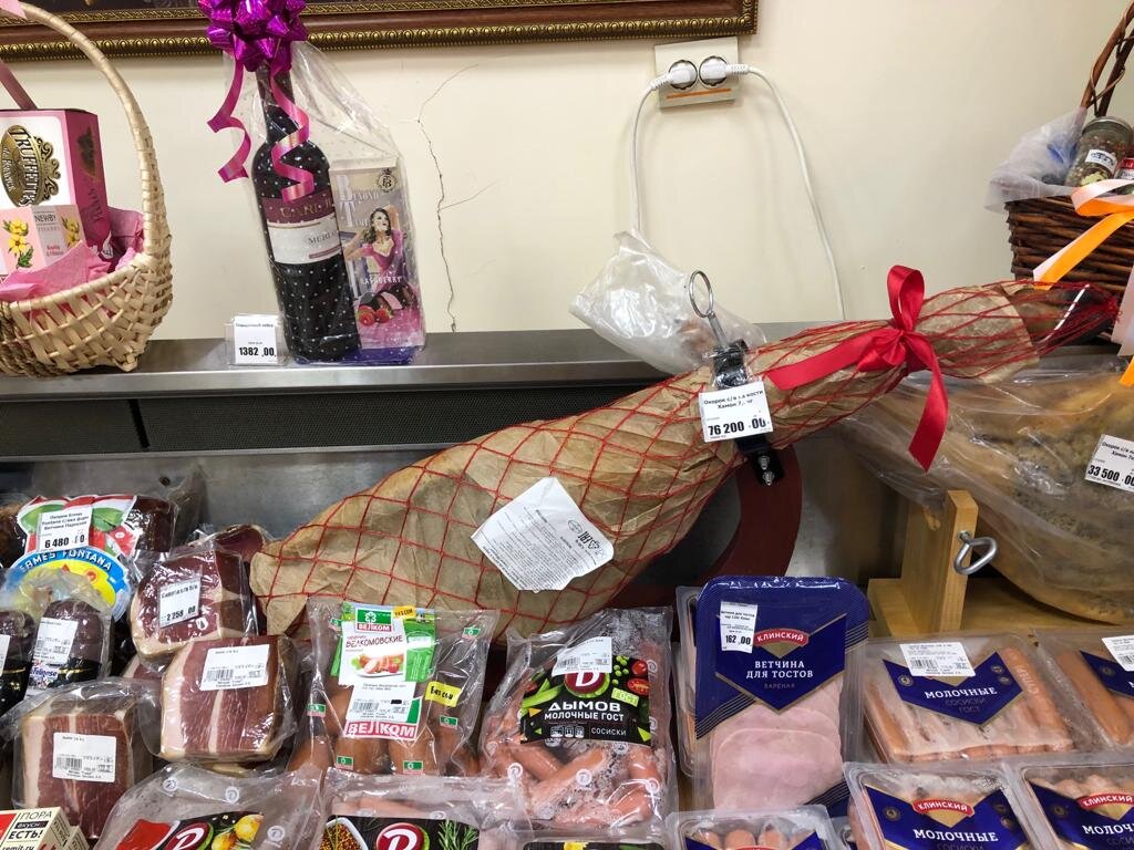 Вообще, дорогие продукты продаются в этом магазине в отдельном закутке, чтобы не смущать обычных покупателей. Именно там можно поживиться хамоном — сыровяленым свиным окороком стоимостью 76 200. Как нам сообщили, это цена за 6-кг ногу с подставкой.