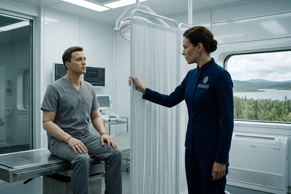 – Прибор готов? – Да, капитан, – сотрудница медслужбы сняла маску, тщательно вымыла руки, – Мы активировали и зарядили инъектор номер один. – Только первый? – Да, – она досуха вытерла руки полотенцем, усмехнулась, – Это чертовски дорогая штука! Компания выдает лишь по два экземпляра на корабль. Так что второго пока оставим на скамейке запасных. На всякий случай. – Хорошо. Капитан подошла к стеклянной стене, посмотрела сквозь нее на белоснежную, ярко освещенную процедурную. – Киберпсихолог его проверил? Все в порядке? – Конечно. Сегодня и начнем. Некоторое время капитан стояла у стекла, задумчиво поглаживая на груди значок “Кап. Инесса Эрст”. Потом направилась к выходу из кабинета, но у самых дверей, успевших разъехаться в стороны, остановилась. – Пожалуй, я сама его осмотрю. Откройте процедурную. – Как скажете, кэп. Только не трогайте руками, он стерилен. Она вошла в белоснежную комнату. Под потолком тихо шелестела климатическая установка, несколько мониторов на столе показывали сложн