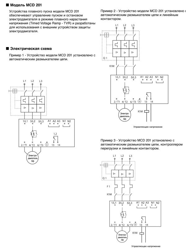 Рассмотрим подключение УПП на примере устройства MCD 201. Софт-стартер этой марки предназначено для приводов мощностью 7,5-110 кВт. УПП обеспечивает запуск и остановку на плавно изменяющимся напряжении (функция Timed Voltage Ramp – TVR) без обратной связи по току. Регулировка напряжения осуществляется по всем трем фазам. УПП имеет встроенный шунтирующий контактор. УПП или устройства плавного пуска – электрооборудование для постепенного старта, разгона и торможения асинхронных электродвигателей. Вне зависимости от особенностей конструкции, софт-стартер состоит: Устройства плавного пуска без встроенных обводных контакторов обычно имеют клеммы для подключения внешних аппаратов коммутации. Компания Данфосс выпускает софт-стартеры VLT для приводов мощностью от 0,1 до 1200 кВт. В линейку УПП входят модели: Устройства различаются по функционалу, электрическим характеристикам и другим параметрам. Выбор УПП Выбор софт-стартера делается при проектировании или модернизации электропривода. При э