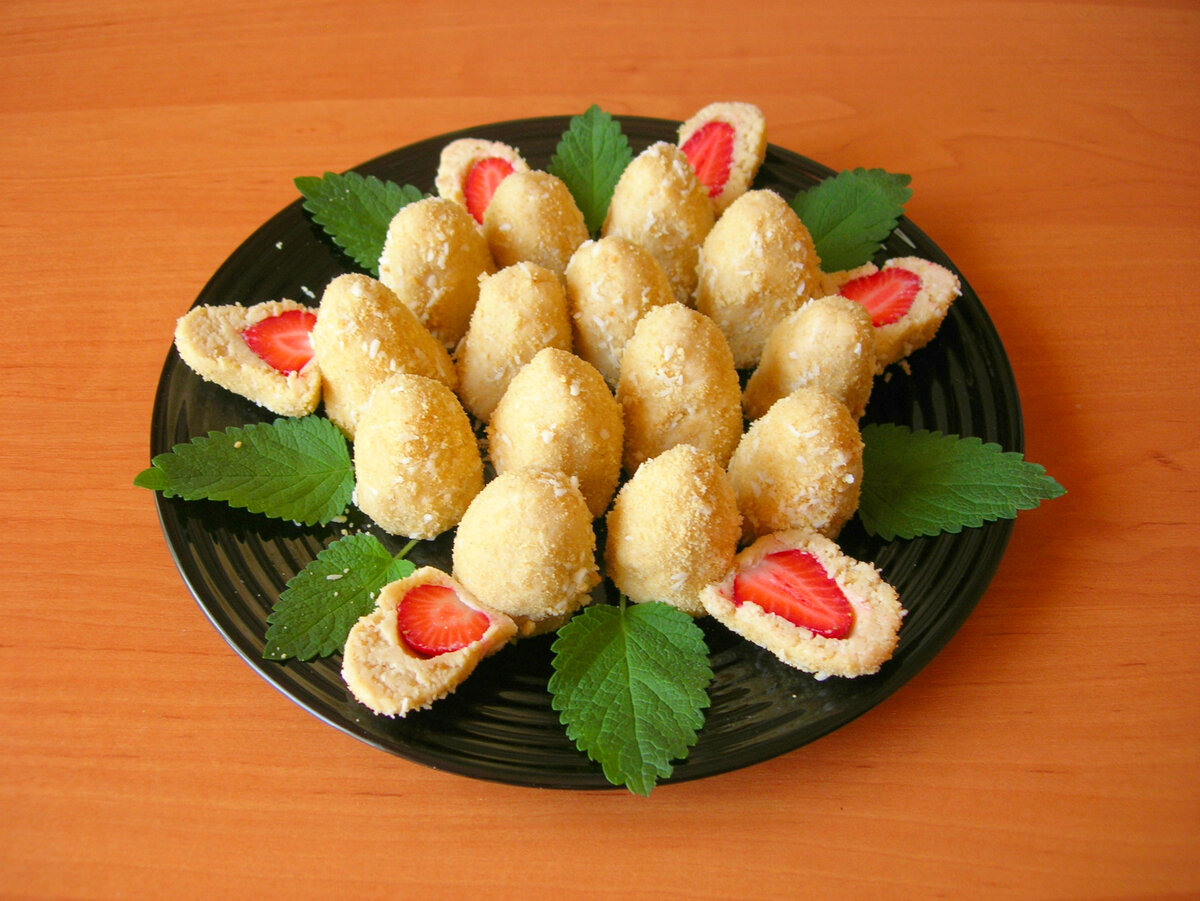 Хочу поделиться рецептом отличного летнего десерта, который готовится всего за 15 минут! Печенье без выпечки с сочной и ароматной клубникой внутри, всем понравится и вкусом, и своей оригинальностью. Ингредиенты: Клубника – 200-250 г Печенье (типа шахматного) – 200 г Сахарная пудра – 80 г Масло сливочное – 50 г Творог – 150 г Кокосовая стружка – 2-3 ст. л. Все подробности в коротеньком видео ниже! Процесс приготовления: 1. Измельчаем печенье в крошку любым способом. Оставляем 50 г на обсыпку. 2. В чашку блендера помешаем измельченное печенье, творог, сахарную пудру, сливочное масло и измельчаем до однородного состояния. 3. Из приготовленной массы скатываем шарики величиной с грецкий орех. 4. Каждый шарик превращаем в лепешку, кладем во внутрь клубнику и формируем печенье в виде шарика или ягодки. 5. Смешиваем измельченной печенье с кокосовой стружкой и обваливаем каждое печенье. Приглашаю Вас посетить мой кулинарный блог о простых домашних рецептах, блюда по которым готовятся в моей се