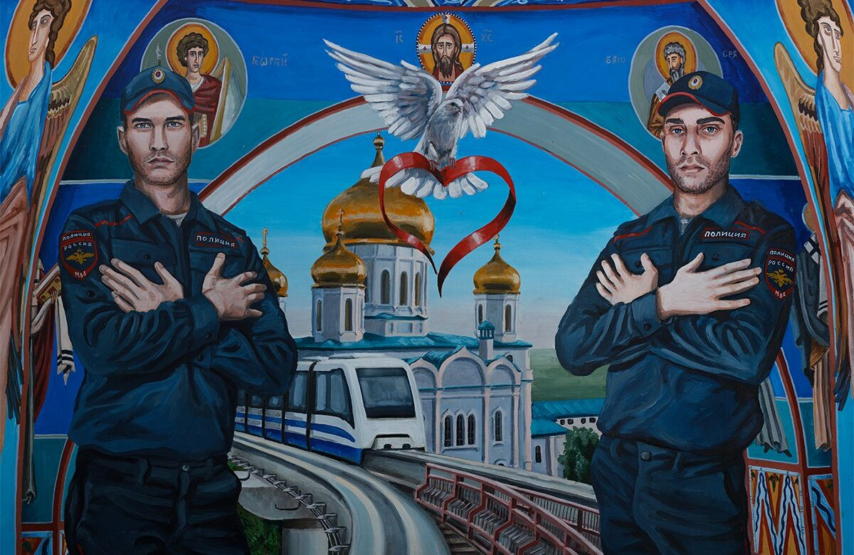 Сказочные и тропические птицы, львы, обезьяны, переходы метро, расписанные под схемы храмовой росписи, ставший уже хрестоматийным кот в шапке-куполе переделывают типичные городские пейзажи в странную мифическую среду. Это новое пространство, наполненное потусторонней и в то же время очень родной, той самой русской тоской.