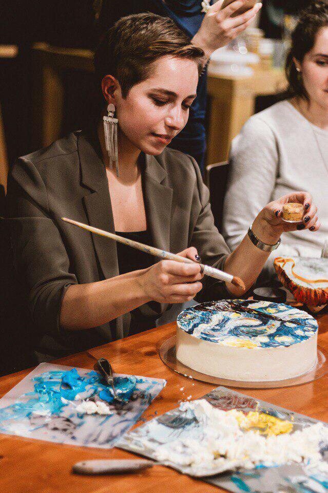 Удивительно, но ко мне часто приходят люди, не связанные с тортами вообще. Мало кто имеет навыки рисования. Мои ученики — люди, которым по каким-то личным причинам нравлюсь я, они разделяют мою философию и хотят побыть в моем творческом мире пару дней, переключить голову, отдохнуть, заняться новым. Они каждый раз удивляются, видя результат своего труда, ведь «они не художники». Некоторые меняют работу после моих мастер-классов. Конечно, приходят и кондитеры — девчонки, которые вдохновились моим проектом и пробовали расписывать свои торты сами, но им не хватает технических навыков, хотят повысить свой уровень мастерства, узнать тонкости, «поставить» руку. Во время творческого кризиса приходят, чтоб вдохновиться и почувствовать себя.