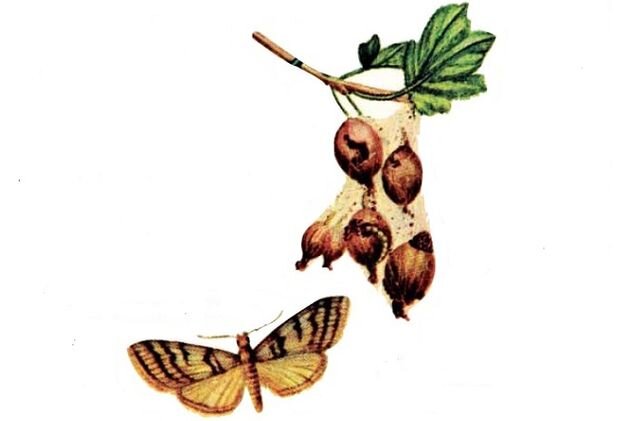 Крыжовниковая огневка является опасным вредителем крыжовника и смородины. Бороться с ней непросто, но и опускать руки при виде плодов, оплетенных паутиной, тоже не стоит. Крыжовниковая огневка – бабочка в размахе крыльев 30 мм, передняя пара крыльев у нее серая с белыми чешуйками и черно-коричневыми поперечными полосками. Часто встречается на территории Тверской, Московской, Ивановской, Владимирской, Тульской областей. Насекомое зимует в стадии кокона, в мае бабочка покидает его и откладывает яйца в бутоны, на лепестки, завязи цветков крыжовника и смородины. Спустя 10 дней из яиц отрождаются ярко-зеленые с черной головой гусеницы, длина их тела составляет 12 см. Гусеницы активно питаются на растениях смородины и крыжовника, в их меню входят цветки, семена и мякоть плода. Поврежденные органы оплетаются паутиной. Ягоды прежде времени окрашиваются, затем загнивают и высыхают. Каждая гусеница повреждает до 6 ягод крыжовника и до 15 – смородины. В середине июня гусеницы опускаются на почву