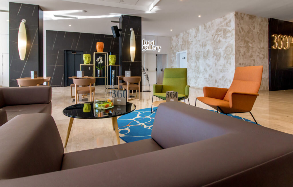 Сегодня мы познакомимся с «Gran Hotel Sol y Mar» - необычным отелем, расположенным в Кальпе на первой береговой линии от моря. Согласно рейтингу на Tripadvisor он считается лучшей четырехзвездочной гостиницей Сообщества Валенсии. Для переделки общественных пространств дизайнер по интерьерам Xavier Pastor сделал ставку на несколько коллекций Inalco и разные способы применения плитки. Изменения заметны начиная с ресепшн. Маленькая стойка для одного сотрудника изготовлена при помощи изделий коллекции Azalai, ставшей синонимом элегантности и эксклюзивности. В месте, предназначенном для отдыха, софы, диваны и кресла марок Andreu World и Momocca образуют отдельные зоны, но физически не разделяют пространство. В центре холла находится бар «Bar 360º». Особое внимание привлекает впечатляющая конструкция в виде купола. На входе стоят две прямоугольные арки, разработанные с использованием моделей новой коллекции Azalai черного цвета. Сквозь них можно увидеть длинную барную стойку, для оформления