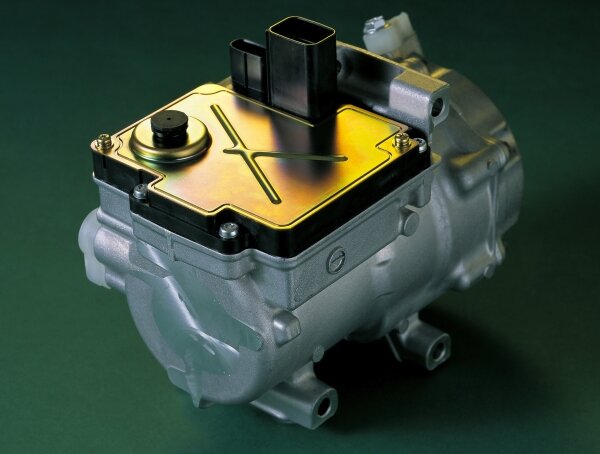 Компрессор спирального типа всасывает, сжимает и нагнетает хладагент в систему кондиционирования. Приводит его в действие бесщеточный электродвигатель постоянного тока с ротором в виде постоянного магнита и обмоткой статора. Питает все это инвертор, который преобразует постоянный ток от высоковольтной аккумуляторной батареи в переменный ток для питания электродвигателя. Электронный блок управления системы кондиционирования подает управляющие сигналы на инвертор через блок высоковольтной батареи для управления частотой вращения электрического компрессора.