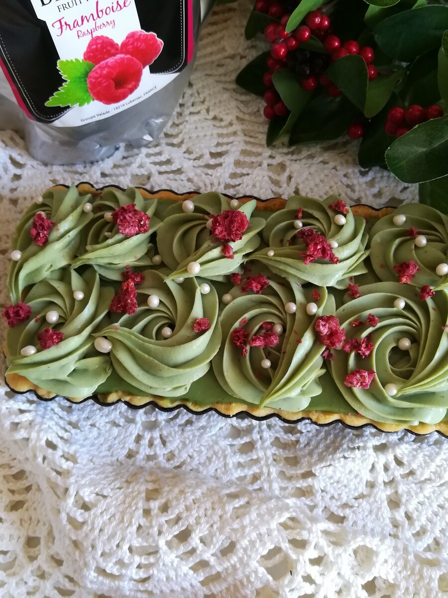 ИНГРЕДИЕНТЫ ПЕСОЧНОЕ ТЕСТО: 120 г муки 4 г разрыхлителя 20 г сахарной пудры 110 г сливочного масла 20 г миндальной муки щепотка соли ФИСТАШКОВЫЙ КРЕМ: 220 мл сливок 33-35% 100 г белого шоколада 20 г фисташковой пасты 50 г сливочного масла МАЛИНОВОЕ КОНФИ:
