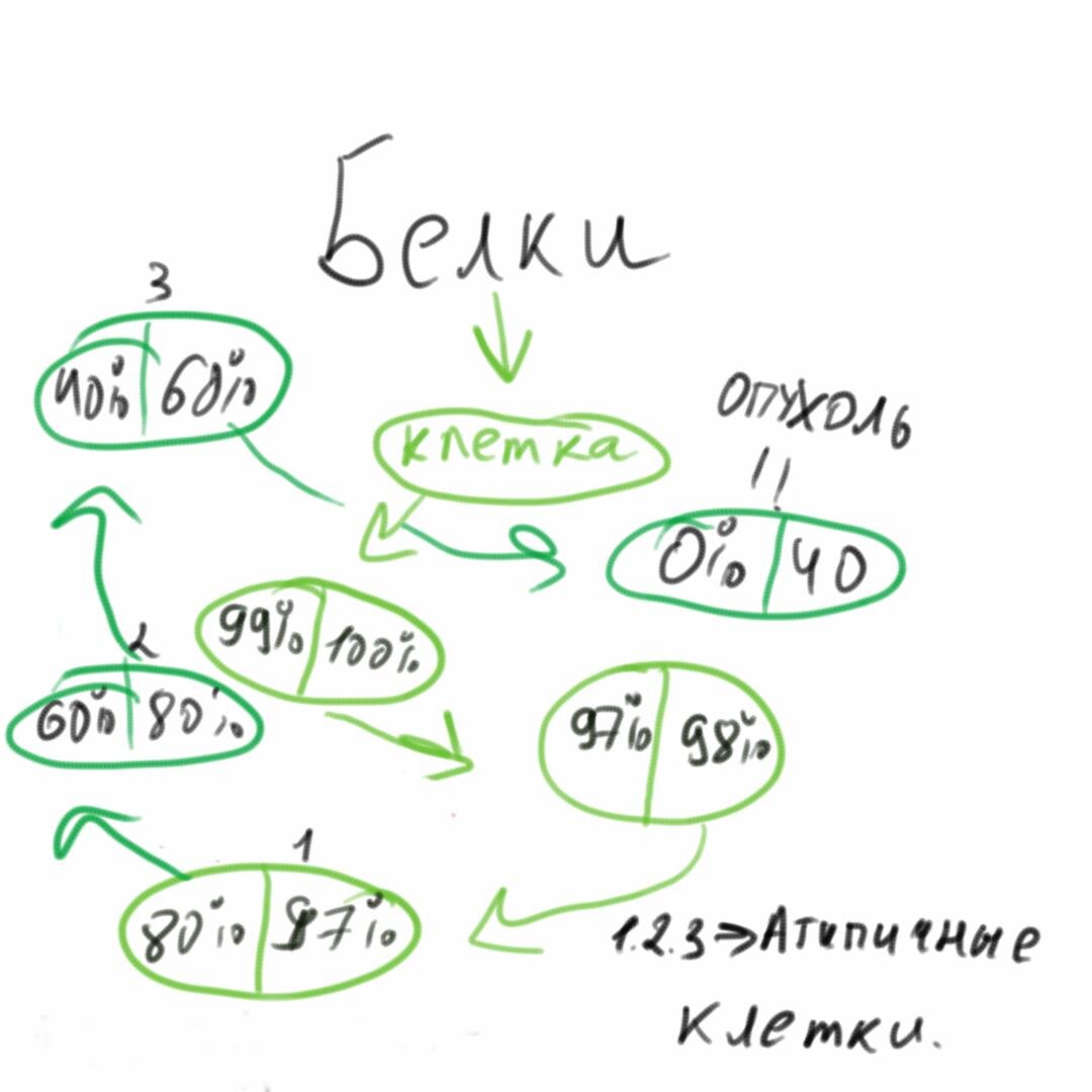 Я рада всех приветствовать у себя на странице, спасибо, что читаете меня :* ⠀ ⠀Сегодня мы поговорим о первом и самом главном компоненте пищи- БЕЛКИ. Белки- это главный компонент пищи. Мы будем говорить о 5 функциях. И начнём с: 1. Структурная. Вот представим клетку 🧿 внутри клетки есть ядро. Все мы помним, что клетка делится. Так вот клетка, которая получается на выходе может быть на 100% идентичная первоначальной (типичная клетка) и быть схожей с первоначальной на 80% и меньше (атипичная клетка). Это есть ничто иное как ОПУХОЛЬ! И чем она меньше похожа на первоначальную, тем больше риска, что она перерастёт в рак. Теперь вы знаете как возникают ОПУХОЛИ! Смотри схемку ниже👹 И главный вопрос ПОЧЕМУ и КАК ПРЕДОТВРАТИТЬ ОБРАЗОВАНИЕ РАКА. ⠀ ⠀Все очень просто. Чтобы клетка получилась типичной в организме должно хватать БЕЛКА. Белок является строительным материалом и если не хватает белка начинают образовываться атипичные клетки. Потому что атипичным клеткам для размножения требуется