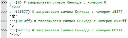 Функция chr( ) возвращает строку (str) с символом Юникода номер которого равен значению аргумента.