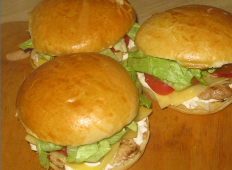 Бургер с куриным филе, замаринованном в сладко-остром соусе терияки, ананасами, помидорами, сыром и салатом. На 3 бургера 3 булочки для гамбургеров 350 гр. куриного филе 6 кружков консервированного ананаса 3 куска швейцарского сыра 6 слайсов помидор 100 мл. маринада терияки салат айсберг майонез Начнем. Куриное филе делим на 6 и каждую часть отбиваем. Заливаем половиной маринада куриное филе, оставшейся половиной заливаем кружки ананаса и убираем холодильник на 5-6 часов. Салат крупно нарезаем. Булочки разрезаем и жарим до золотистой корочки. Ананасы сливаем и ставим в духовку, режим гриль, на несколько минут с каждой стороны. Курицу так же сливаем и жарим в той же сковороде, где жарили булочки, только на оливковом масле. Сразу как только курица будет готова выкладываем на каждое филе по куску сыра, чтобы он начал немного плавиться. по выложить на курицу сыр, чтобы сыр расплавился. Сборка. На нижнюю булочку выложить майонез, сверху курицу с сыром, помидоры, ананас, салат, н