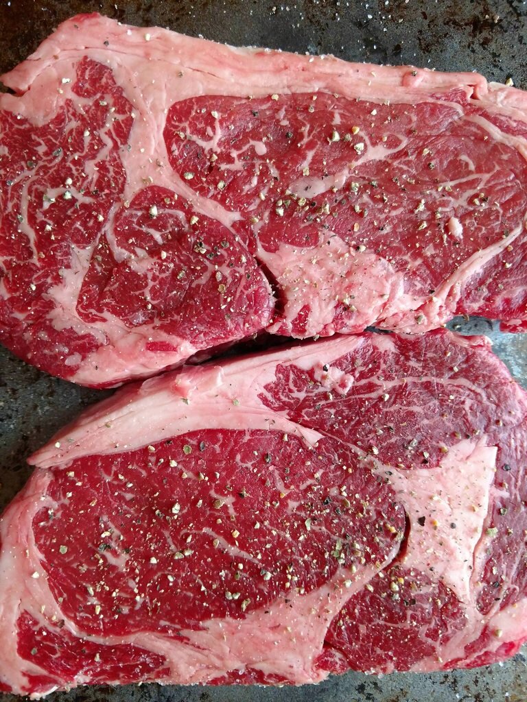 Всем Привет!:) Зовите меня просто Рибай(с англ. rib-ребро eye-глаз), меня вырезают из реберной части; полоска жира, которая пронизывает кусок мяса называется "глазок", толщина такого стейка варьируется от 2 до 6 см и вес может доходить до 800гр. Значит, нам понадобится: 1)Стейк рибай-кусок 300гр 2)Розмарин-5гр 3)Тимьян-5гр 4)Соль морская крупная-50гр 5)Чеснок-20гр 6)Масло сливочное- 50гр 7)Сковородка рифленая - 1шт 8)Масло растительное - немного, чтобы смазать сковороду 9)Свежая зелень-укроп, петрушка 1.Для начала достаем стейк из заморозки за два часа до готовки, чтобы он был комнатной температуры, и это очень важный фактор; некоторые считают, что замороженный стейк можно разморозить за минуту обернув его пищевой пленкой и подержать под теплой струей из-под крана, НО Я СЧИТАЮ стейк должен размораживаться при комнатной температуре, а как вы считаете, дорогие мои? 2.Так, стейк есть, обваливаем его в соли и даем полежать минут 10-15, всю соль, которая ему нужна, он впитает. 3.Разогревае
