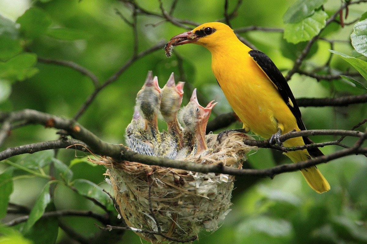 Иволги известности не занимать: и песни о ней складывали, и название ее у многих на слуху. А еще ее называют птица-флейта. Но вот за три месяца ее пребывания у нас, на родине, можно ежедневно слышать ее красивейший голос, и при этом не увидеть ни разу. Иволга широко распространена у нас не только в лесах и перелесках, но и в скверах и парках городов и поселков, где есть старые деревья хотя бы 3-4 метра в высоту. Но, конечно, больше всего эту певунью привлекают леса, где есть липы. Это лубяная порода деревьев, а птице, чье гнездо напоминает корзинку, обязательно нужно надрать лыка, хотя бы немного, чтобы сделать основу для своего домика. Сплетенная корзиночка потом устилается травинками, перьями, берестой и прочими мягкими материалами. Конечно, если в окрестностях лип не найдется, подойдет и яблоневая кора. В городах птицы и вовсе используют для постройки гнезд вместо природного материала обрывки бумажных шпагатов, а в качестве подстилки - паклю, фантики и прочий городской мусор. Эта п