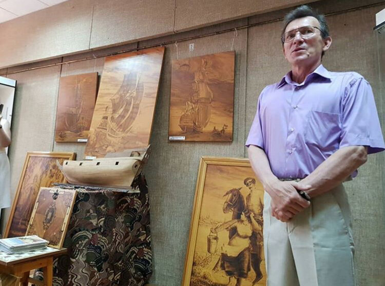 В историко-краеведческом музее Михайловска состоялась презентация персональной выставки Александра Новикова. Первое знакомство с этим мастером состоялось для многих горожан в День Победы, когда он представил на площади собственноручно сделанный муляж легендарного танка Т-34 в масштабе 3:4. Но у Александра много других работ, выполненных в разных техниках: маркетри, гризайл и резьба. Они и представлены на открывшейся выставке.