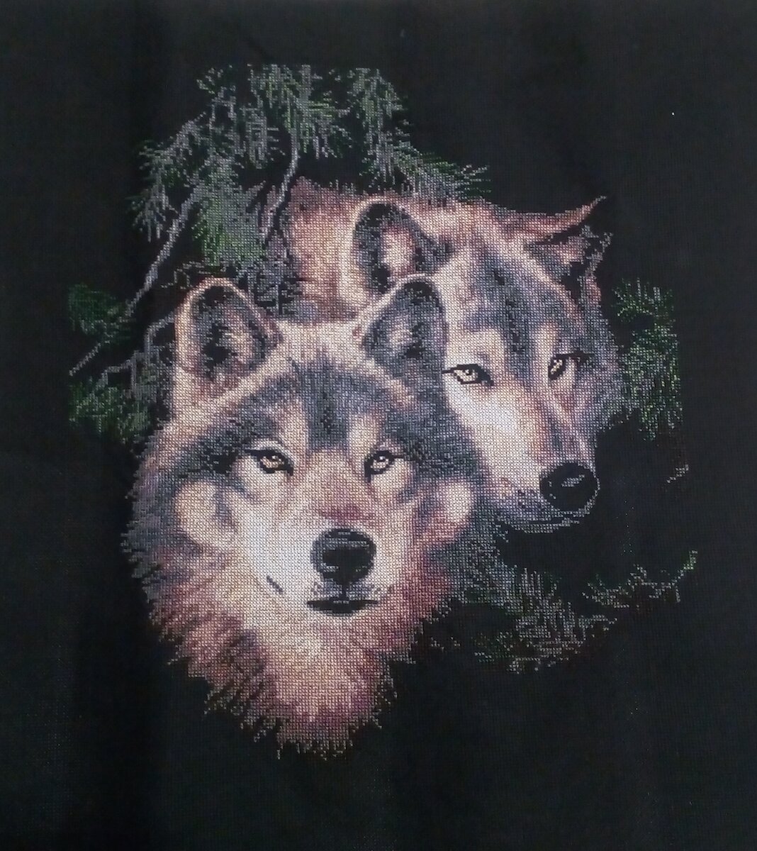 Пару лет назад я находилась в поиске схемы или наборы для следующей вышивки. Захотелось именно пару волков, в наших магазинах в продаже не нашла ничего подходящего, в интернет-магазинах тоже.... Вот прям застряла картинка в голове, и ничего другого не хотелось, смотрела даже на Али-Экспрессе, хотя ни разу не заказывала там вышивку. И вот чисто случайно нашла в интернете отсканированные страницы какого-то украинского журнала - это именно то, что я искала! Пара волков (только головы), хорошо прорисованные, на черном фоне. В схеме предлагалось вышивать фон черными нитками на белой канве, но это точно не для меня, поэтому я купила сразу черную канву. Нитки подбирала где-то на глаз, где-то по онлайн-переводчику из DMC в Гамму. Готовый результат: Схема оказалась не очень простой: есть одиночные крестики, блоки одного цвета маленькие и сильно разбросаны по рисунку. Но все таки это не прогон, над схемой поработали, спасибо за это авторам. В конце уже глаза устали от че