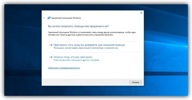 2. В открывшемся окне щёлкните «Пригласить того, кому вы доверяете, для оказания помощи». Если система сообщит, что компьютер не настроен, нажмите «Исправить» и следуйте подсказкам. Возможно, после изменения настроек придётся перезапустить утилиту.