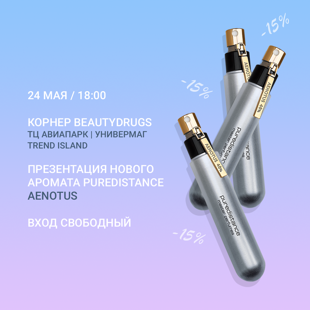 Арома-любители и парфманьяки! Приглашаю вас посетить уникальное событие – презентацию нового аромата Aenotus одной из самых эксклюзивных селективных марок парфюмерии в мире Puredistance! На мероприятии будет представитель бренда из Нидерландов – Алина Сурнина из первых рук расскажет о марке, об ароматах и о том, как парфюм может подчеркнуть ваш статус. 24 мая, 18:00, корнер Beautydrugs в универмаге Trend Island, Авиапарк, Москва. Каждый присутствующий получит приятный подарок от Puredistance - миниатюру на выбор, а также 15% скидка на весь парфюм бренда. Плюс- у Вас будет возможность познакомиться со мной лично!! Давайте встречаться! С уважением, Парфюмер Валерия Нестерова