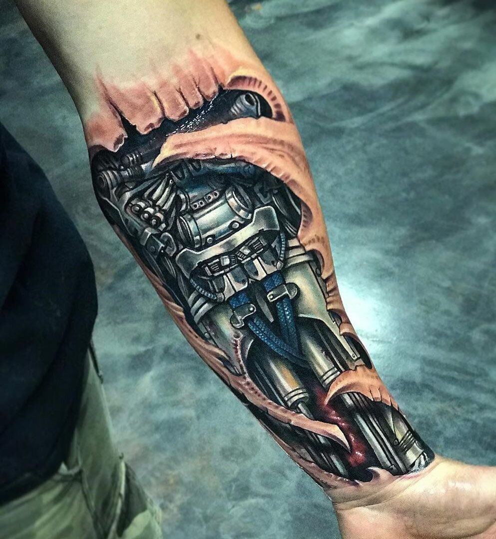 Анатомия Тату № 1 в рейтинге Москвы -http://rating.msk.ru/tatoo/anatomiya_tattoo/ Данный стиль появился еще в восьмидесятых годах 20 столетия на территории Соединенных Штатов Америки. Наибольшее распространение он получил в начале нового тысячелетия. Если вы взгляните на фото тату биомеханика, обязательно отметите, что такие нательные рисунки символизируют новую эпоху развития человечества. В первую очередь речь идет о разнообразных новых технологиях, современных гаджетах, роботах и так далее. Большинство эскизов тату биомеханика пытаются продемонстрировать человеческий потенциал в сочетании с прогрессивными технологиями. Биомеханика – тату с прогрессивной начинкой Одним из сподвижников татуировок биомеханика считается швейцарский художник Ганс Гигер, который одним из первых начала работать в стиле фантастической реальности. Это очень известная личность не только для мастеров татуировки, но для любителей кинофантастики. Ведь именно он внес весомую долю в съемку культового фильма «