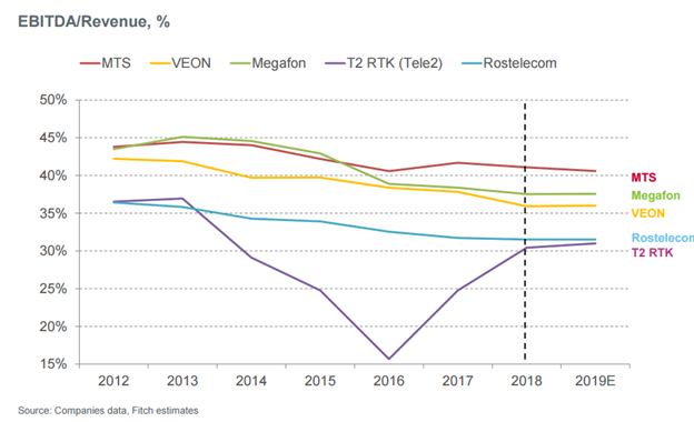 Из крупнейших операторов наилучшие показатели рентабельности демонстрирует МТС (также является лидером по Pre-Dividend Free Cash Flow/Revenue). В негативную сторону за счет стратегии агрессивного роста несколько последних лет выбивался Tele 2, однако по итогам 2018 г. соотношение EBITDA/Revenue для компании приблизилось к уровням конкурентов (в среднем 30-40%).