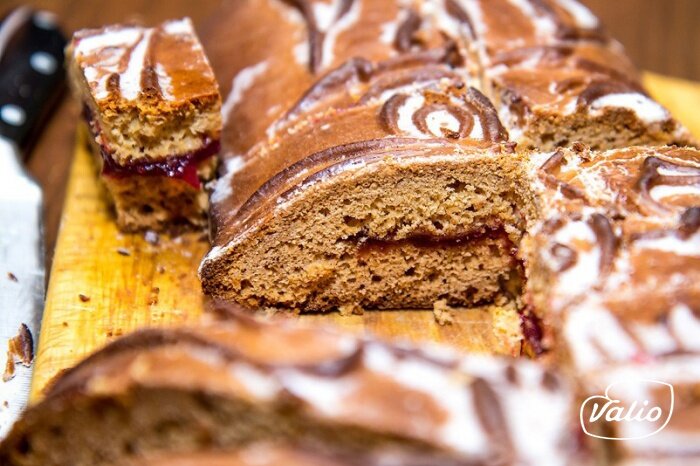 • Маргарином смазываем лист. берём первый корж и его раскатываем, смазываем вареньицем и сверху кладём наш второй коржик. Защипываем края корж ложкой или вилкой и ставим в духовку. Коржи выпекаем на среднем огне.