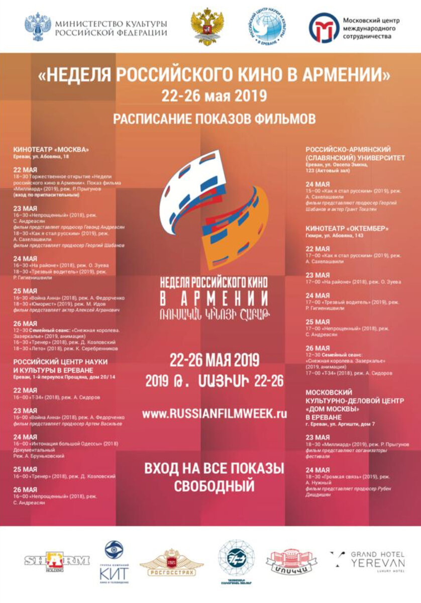 Мероприятие проводится при поддержке Министерства культуры РФ, Посольства РФ в Республике Армения, Российского центра науки и культуры в Ереване, Московского центра международного сотрудничества Департамента внешнеэкономических и международных связей города Москвы, Федерального Фонда Социальной и экономической поддержки отечественной кинематографии.