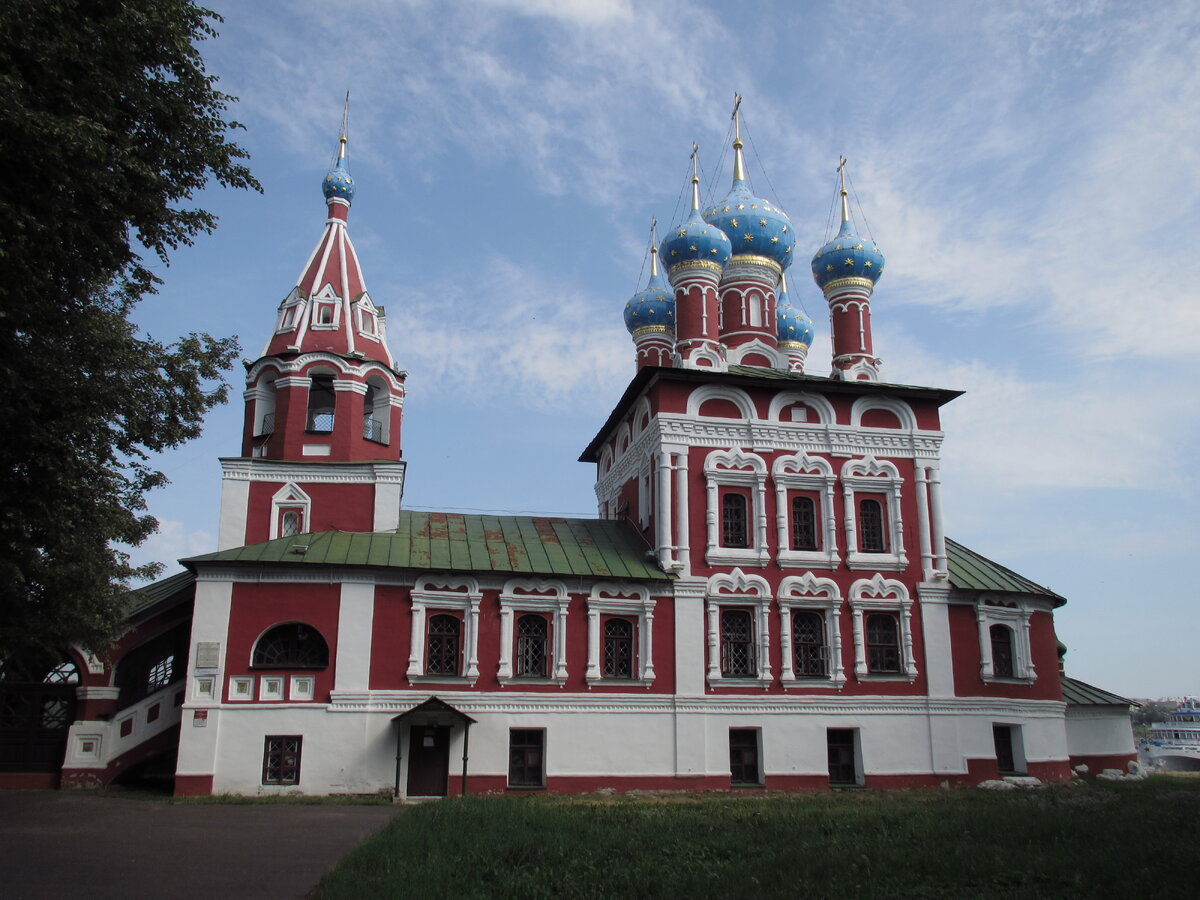 Роковое событие, произошедшее в Угличе с младшим сыном Ивана Грозного в 1591 году, сделало город трагически известным в русской истории. На том месте, где погиб последний Рюрикович - наследник российского престола, в 1692 году уже представители рода Романовых - Пётр и Иоанн Алексеевичи повелели построить каменный храм в память о трагической кончине царевича Димитрия. Церковь возвели на месте её рубленой шатровой предшественницы 1630 года постройки, в которую первые цари династии Романовых делали богатые вклады. Один из таких вкладов - икона "Богоматерь Смоленская" - подарок Михаила Фёдоровича Романова. При посещении церкви царевича Димитрия, нас предупредили, что снимать её интерьеры запрещено. А жаль, так богато украшенных и красочно расписанных храмов нам встречалось немного. Большинство росписей посвящены роковой истории, связанной с гибелью царевича и с событиями ей предшествующими. Кроме того, в церкви хранятся реликвии - свидетели трагедии. Главным экспонатом является набатный колокол, известивший о гибели отрока. За эту провинность роковой чугунный вестник был бит плетьми, лишён языка и уха и сослан в Сибирь, откуда возвращён в Углич в 1892 году. Среди других реликвий - серебряная икона-мощевик с осколками орехов, бывших у царевича в руках во время убийства; носилки и рака, в которых в 1606 году в Москву были перенесены мощи Димитрия; и большой слюдяной фонарь, который несли тогда перед процессией.