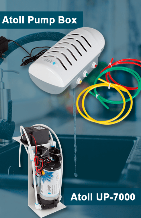 Насос UP-7000 – производится и используется более 10 лет. В его комплектацию входят: насос с подводящими трубками, датчики, трубки, провода, блок питания 24V, всё закреплено на кронштейне. Насос UP-7000 совместим только с классическими моделями систем обратного осмоса. Устанавливается сбоку на кронштейне, или лежа, что может создавать дополнительную вибрацию и повысить уровень шума. Вес устройства: около 4 кг. Аtoll Pump Box