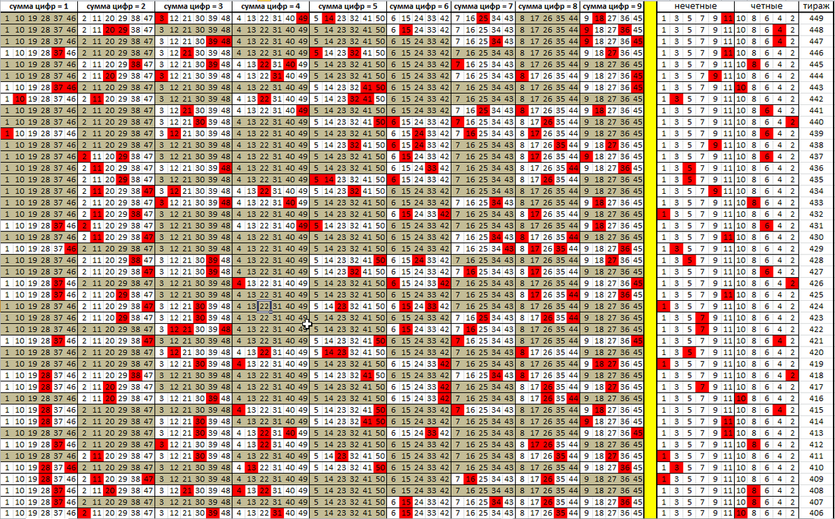 Итак, наша основная методика для первой корзины (50 чисел) - компоновка групп чисел по сумме цифр их составляющих. Для второй корзины (11 чисел) - компоновка чисел по признаку четности / нечетности.