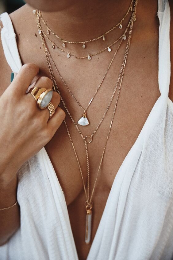 Если выбирать шейные украшения, стоит обратить внимание на цепи. Отдаем предпочтение как тонким, так и массивным, с подвесками и без. Носим несколько одновременно.