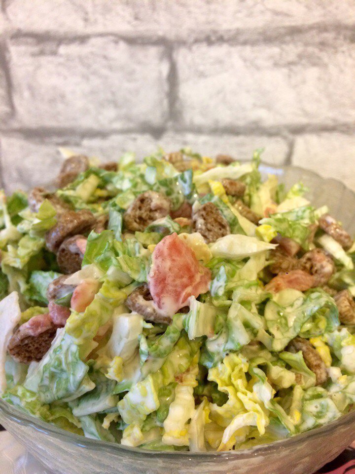 Приготовление : капусту режем , высыпаем сухарики , режем рыбку и добавляем майонез