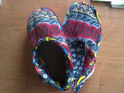 Нашла в интернете довольно простой способ сделать выкройку домашних тапочек и сшить их. Попробовала сшить, но пока сшила только один, в основном чтобы показать как шить. Второй закончу позже. Я в первый раз шью тапочки, поэтому не все у меня гладко получилось, но сам принцип шитья расскажу. Чтобы сделать выкройку, надо сделать болванку, для этого могут пригодиться пластиковые или резиновые тапочки. У меня нашлись не тапочки а шлепанцы, но тоже подойдут. Набиваю шлепанцы ветошью. И натягиваю старый носок, но надо сделать болванку с пяткой, поэтому приспосабливаю Стакан подходящий по размеру. Все затягиваю носком. Сверху натягиваю второй носок.(Сразу скажу, что второй носок лучше использовать белого или очень светлого цвета, далее вы увидите почему). Оборачиваю все это скочем. Прикладываю обычную войлочную стельку к подошве и очерчиваю ее, вот почему носок лучше светлый, можно было чертить шариковой ручкой по скочу, а на синем фоне не видно линий, мне пришлось исп