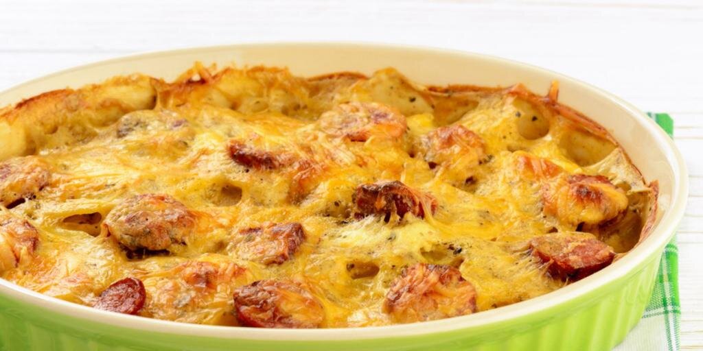 Нам понадобится: 1 килограмм картошечки, 400 грамм вареной колбаски, 200 грамм горошка, 100 грамм твердого сыра, 2 луковицы, 400 грамм сливочек, 2 столовых ложки подсолнечного маслица, мускатный орех. Готовим: Картошечку помыть, аккуратно выложить в кастрюлю с кипящей соленой водичкой. Отваривать в мундире 15 минут. Дать немного остыть, почистить и порезать картошечку кусочками. Колбаску порезать полукольцами, лук - полосками. Почистить и измельчить чеснок. На сковородке разогреть маслице. Обжарить колбасу. Добавить туда лучек и чеснок. Жарить еще пару минут. Горошек ошпарить кипятком, откинуть на дуршлаг. Сливки смешать с тертым сыром, приправить солью, перцем и мускатным орехом. Укладывать слоями кружочки картофеля, колбасу с луком и горошек. Последний слой - картофель. Залить сливками. Запекать 30 минут при температуре 180. Приятного вам аппетита! фото для данной статьи взяты из интернета ) Если Вам была интересна моя статья, ставьте лайк, ну и не забудьте подписаться на мой кан